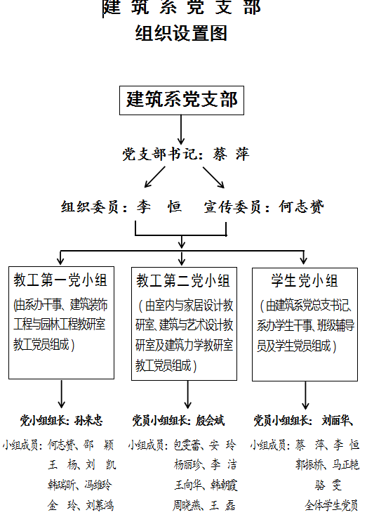 建筑系党支部现有党员24名,占全系教师比例57%。支部委员由党支部书记、组织委员、宣传委员组成。