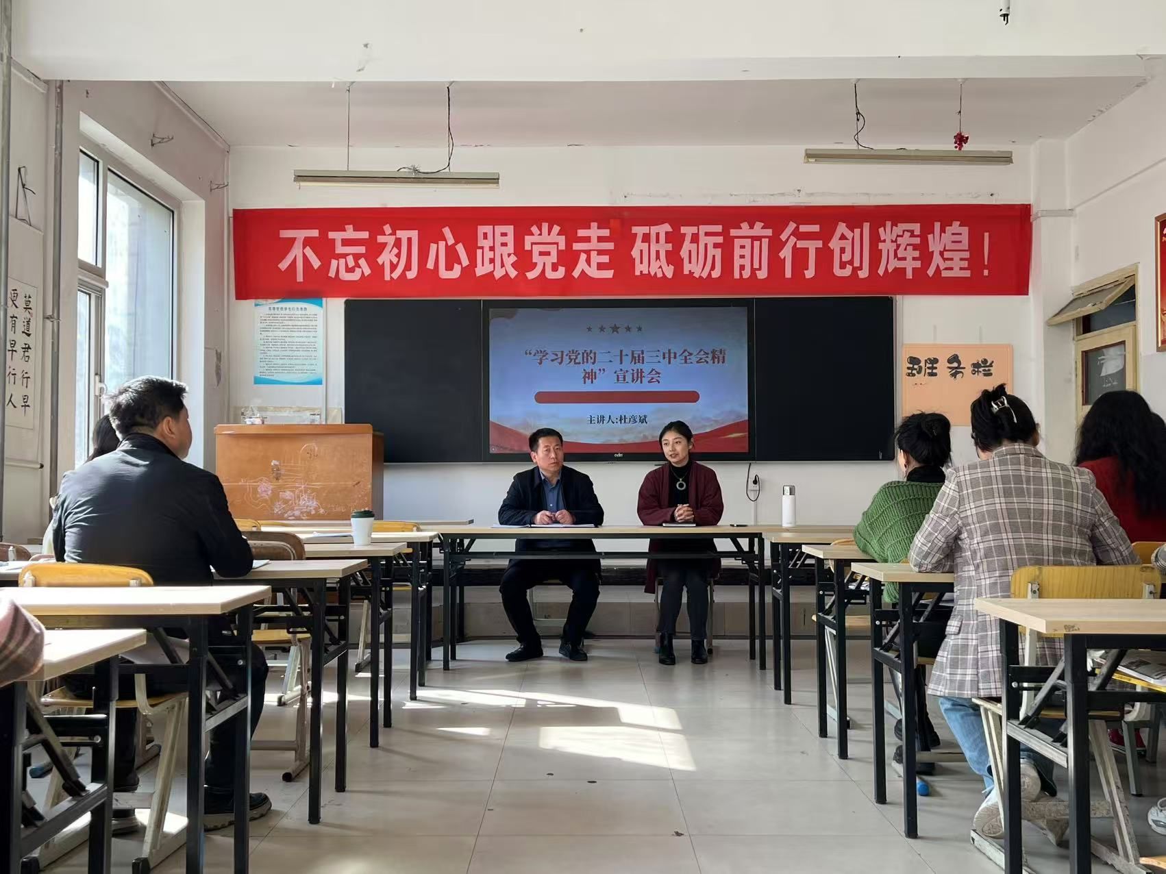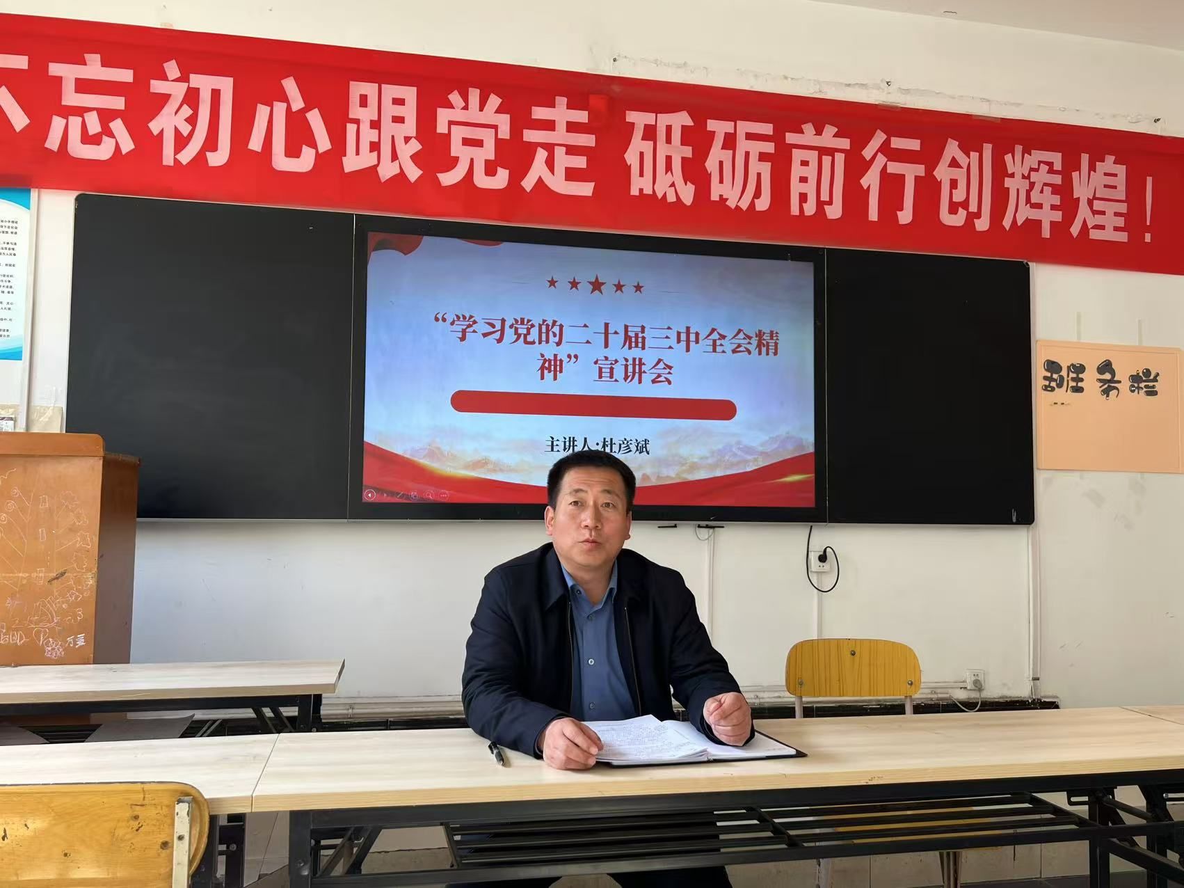会议第三项杜彦斌带领全体教师专题学习了习近平总书记视察甘肃重要讲话,新华社新闻通稿《深化改革勇于创新苦干实干富民兴陇 奋力谱写中国式现代化甘肃篇章》,习近平总书记2013年、2019年在甘肃省考察工作结束时的讲话,习近平总书记主持召开全面推动黄河流域生态保护和高质量发展座谈会精神;传达学习了习近平总书记《论教育》等内容;传达学习了教育法规和法律法规等相关内容。杜彦斌要求,要深刻学习领会习近平总书记视察甘肃重要讲话和指示精神的丰富内涵和实践要求,坚持把习近平总书记视察甘肃重要讲话和指示精神,与党的二十届三中全会精神和党的十八大以来习近平总书记对甘肃系列重要讲话重要指示批示精神结合起来,切实把思想和行动统一到习近平总书记重要讲话重要指示精神上来,统一到党中央决策部署上来,牢记嘱托,感恩奋进,始终沿着习近平总书记指引的方向前进,奋力谱写中国式现代化甘肃篇章。