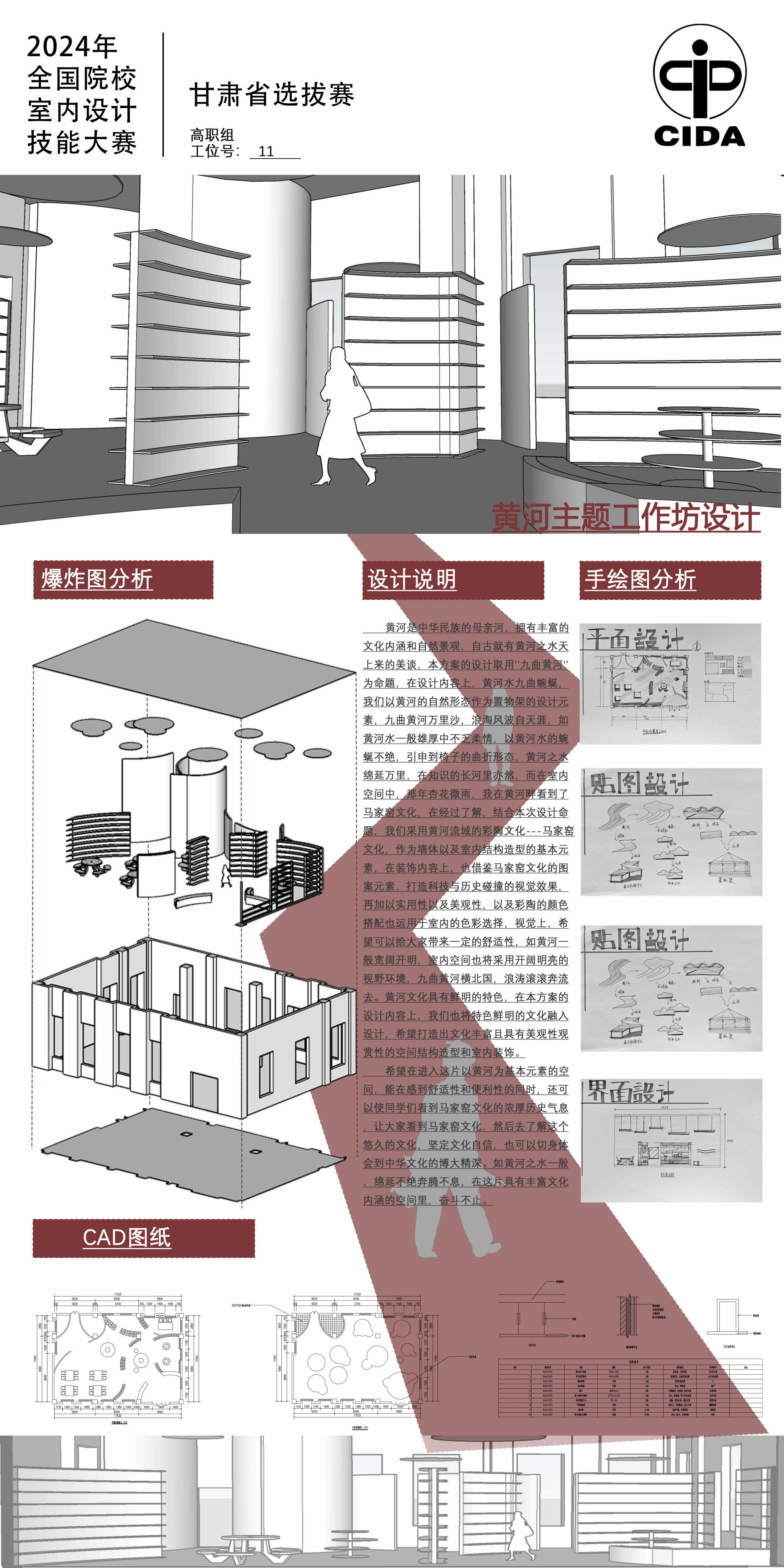 本次竞赛总时长7小时,分三个模块分别进行,参赛选手需完成全部任务。设计内容以“九曲黄河进校园”为主题的工作坊。设计背景为坐落于某公办小学的主体建筑内,工作坊以“九曲黄河进校园”为主题,具有浓厚的校园文化底蕴,主题鲜明,个性突出,丰富了当代学生的活动。空间概况请参照附件中的平面图及基本空间模型文件,南面为主入口,层高6.0米,外门高2.5米。