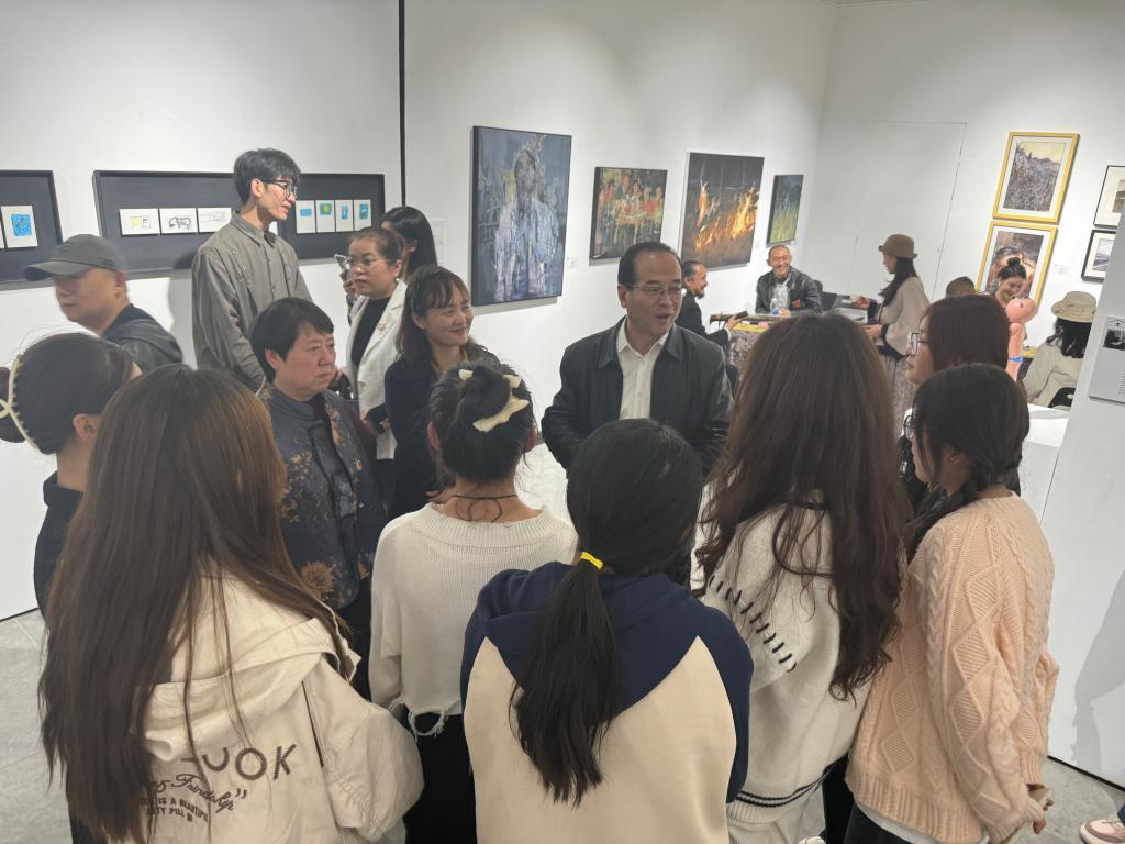 李君宏与师生交流时谈到,学院近年来十分重视美育教育工作。要充分认识美学教育在开发学生潜能、促进学生现代化素质发展中有重要地位、功能和作用。要培养学生体验美、欣赏美、创造美的能力,全面提高师生美育素养和整体素质。许洁在学术交流会中表示,学院高度重视本次活动,希望通过这样的展会提升学生审美观念。在当今竞争激烈的市场环境中,越来越多的企业注重员工的艺术素养。因此,了解美育教学的价值,意义重大。今后学院会进一步提高人才培养质量,为社会提供精准的人才供给。