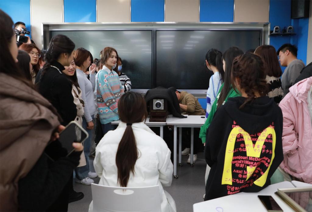 赵贵琦老师首先向同学们介绍了湿版摄影,他讲到,“一块透明的玻璃、一些‘神奇’的药水、一个黑色的盒子,就可以带你走进‘摄影的维多利亚时代’”。他现场演示了如何利用一块透明的玻璃制作出迷人的玻璃照片,整个过程如同变魔术一般。同时,同学们实地观摩了超大画幅24寸相机的魅力并亲自调节相机的光圈,感受到时代的记忆。