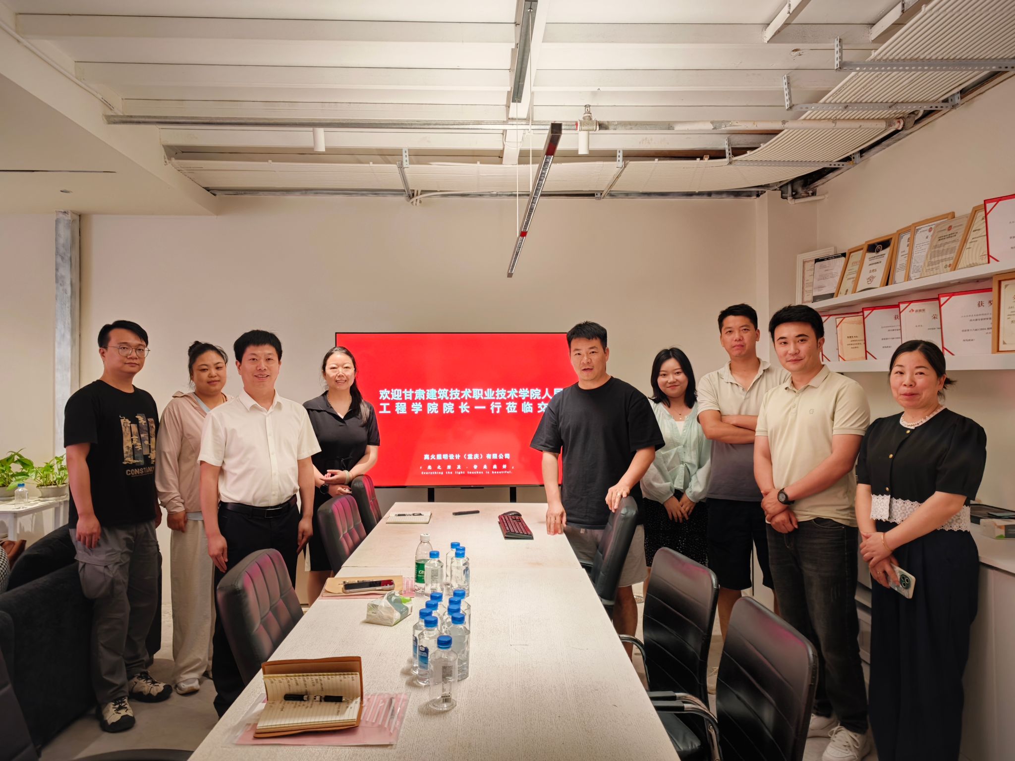 为深化产教融合、精准对接建筑光环境设计领域人才需求,甘肃建筑职业技术学院人居工程学院院长孙来忠教授率空间建造、环境设计教研室主任、设计艺术教研室副主任一行4人,于6月16日赴离火照明设计(重庆)有限公司(以下简称“离火照明”)开展访企拓岗专项调研。双方围绕智能照明设计人才联合培养、实习基地共建、课程开发达成合作意向,为建筑类高职人才开拓智慧照明新赛道奠定基础。