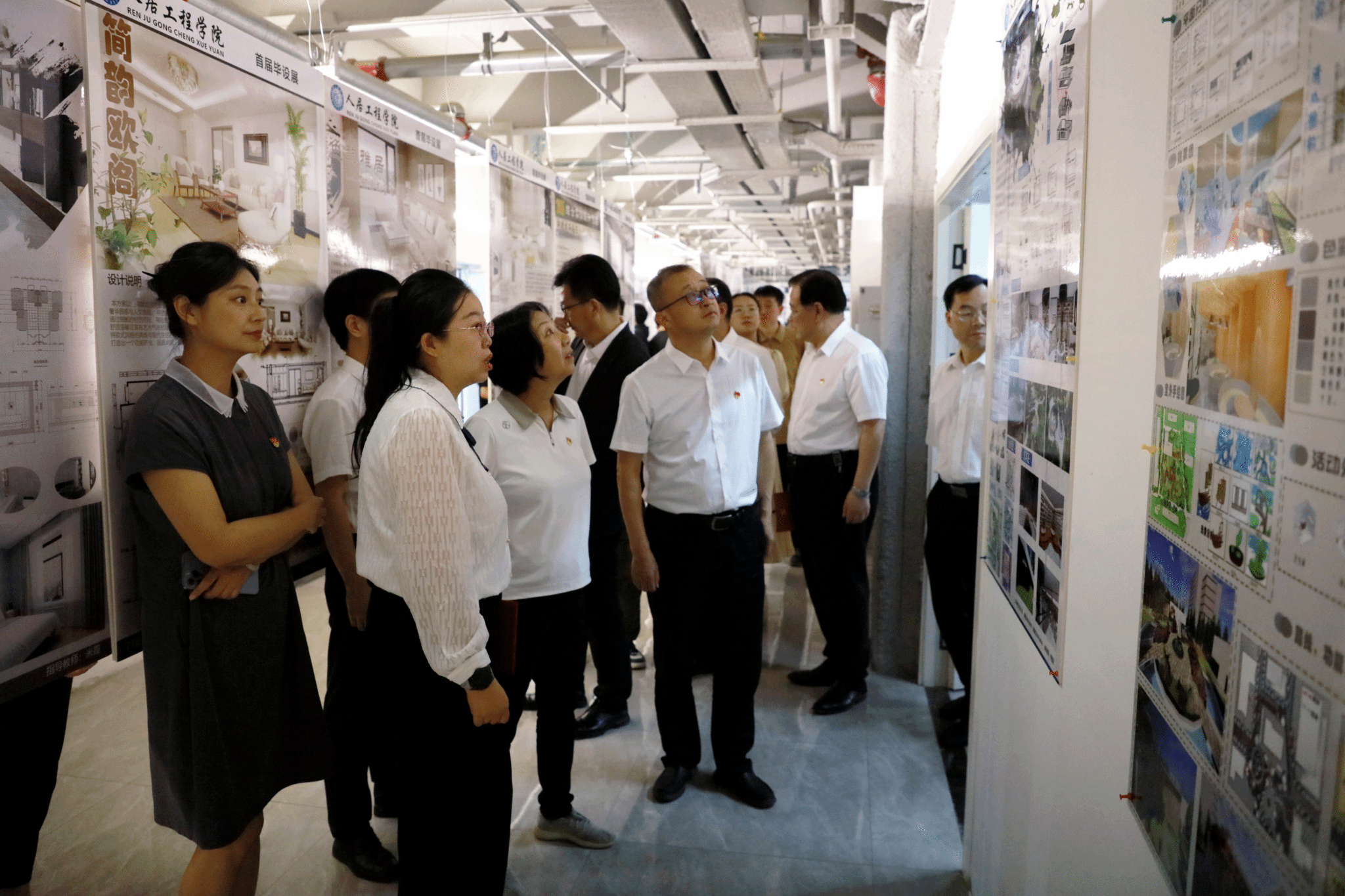 7月1日,人居工程学院首届毕业设计作品展在食堂四楼会议中心拉开帷幕。学校党委书记王娟丽,党委副书记、校长党星海,学院相关领导及各专业老师到现场参观,并对参展作品给予了较高评价。 人居工程学院党总支书记蔡萍和院长孙来忠陪同观展。