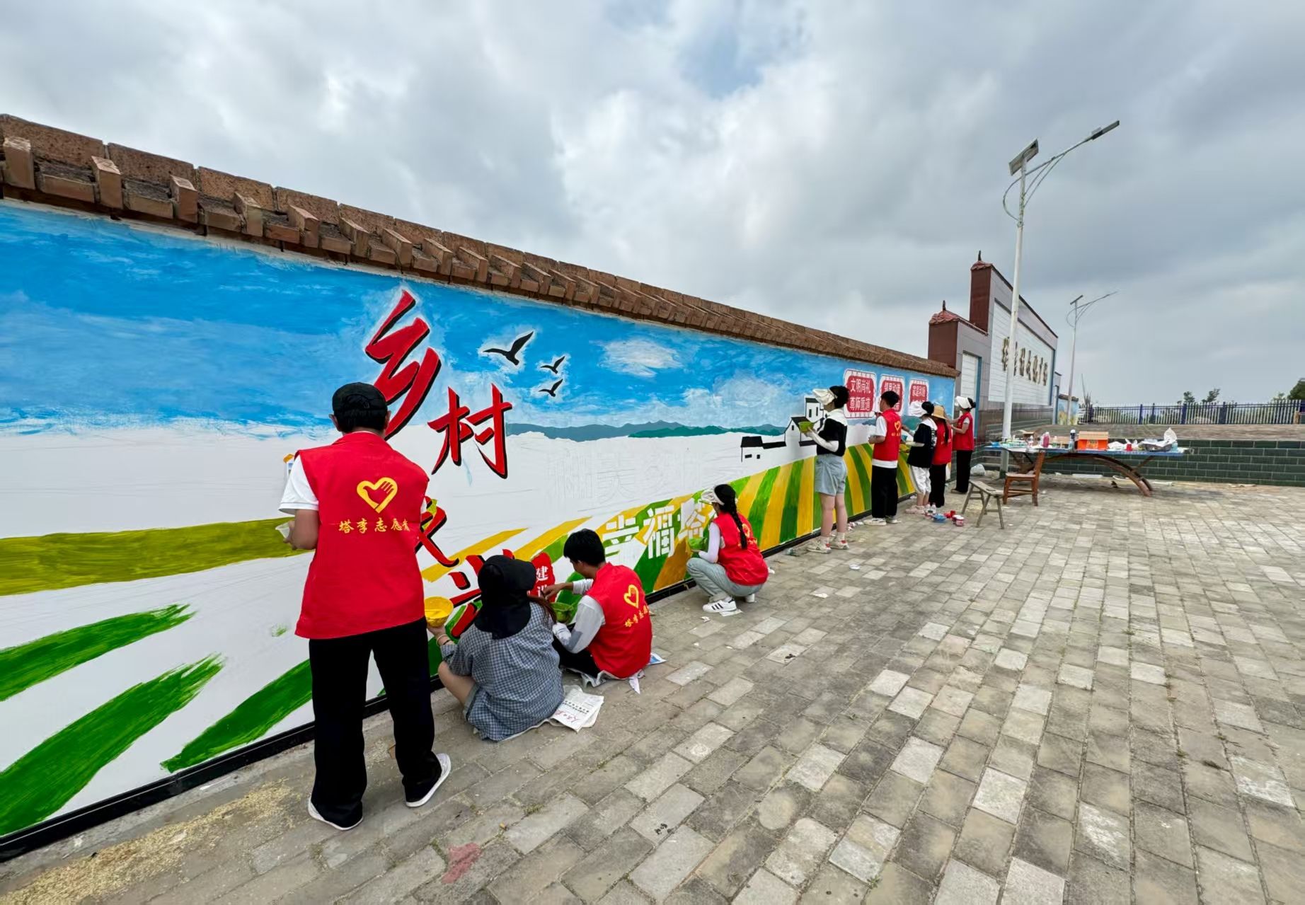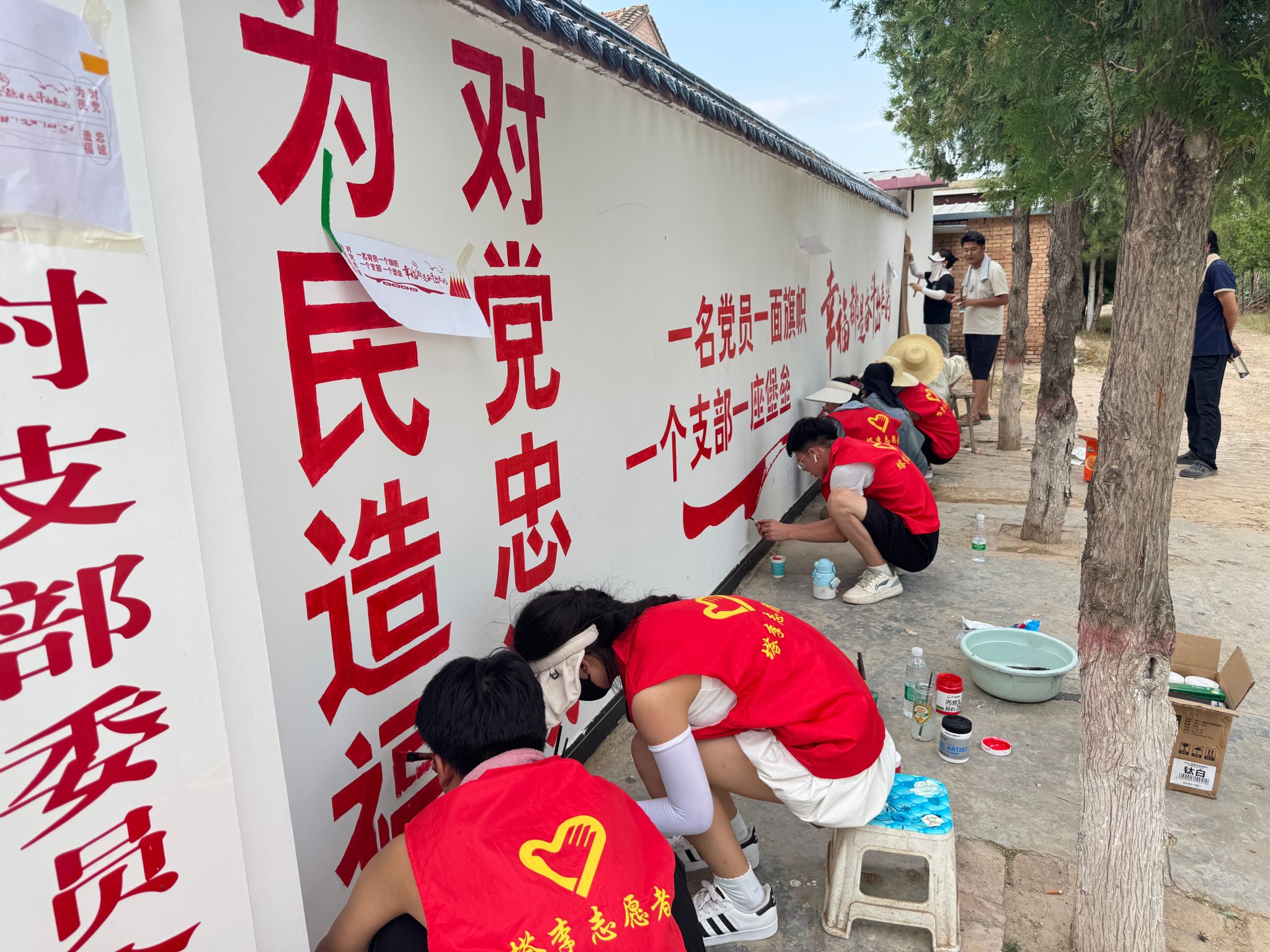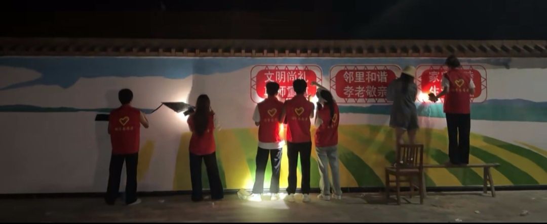 在绘制墙绘的过程中,村民们也被队员们的热情和专注所感染。一开始,村民们只是好奇地围观,看着这群年轻的身影在墙上忙碌;渐渐地,一些村民主动送来了清凉的茶水和解暑水果,并时时驻足观赏、点赞夸奖声不断,关切地询问队员们累不累;还有的村民自告奋勇地帮忙递工具,虽然不太懂绘画的技巧,但他们的热情和支持让队员们倍感温馨。一位大爷感慨地说:“你们这些娃娃,大老远跑来,为我们村子画画,真的太感谢你们了。”这些质朴的话语,更加坚定了队员们完成墙绘的决心,让深深体会到付出的意义与价值。