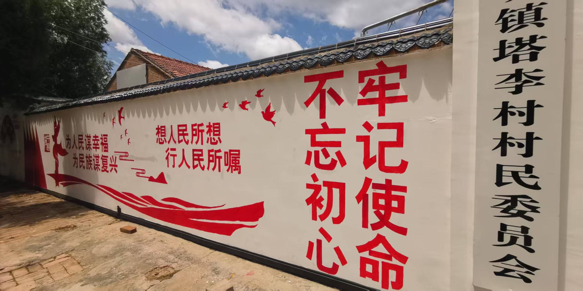 此次实践活动中,最令人瞩目的是以乡村振兴为主题的墙绘活动。为了能在有限的时间内完成主题鲜明、绘制精美的墙绘作品,活动前期,实践队与驻村老师多次沟通交流确定彩绘主题、设计彩绘初稿。到达塔李村即刻开展实地勘察、走访调研,与村委会干部、村民代表深入交流,了解村庄的历史文化、民俗特色及发展愿景,完善修改设计图稿,确定“和美乡村、兴福塔李”设计主题。其中村委会大门两侧为“对党忠诚为民造福”、“不忘初心牢记使命”“移风易俗”、“乡村振兴”四个红色主题,文化广场主席台两侧为“和美乡村兴福塔李”、“社会主义核心价值观”2个田园主题。